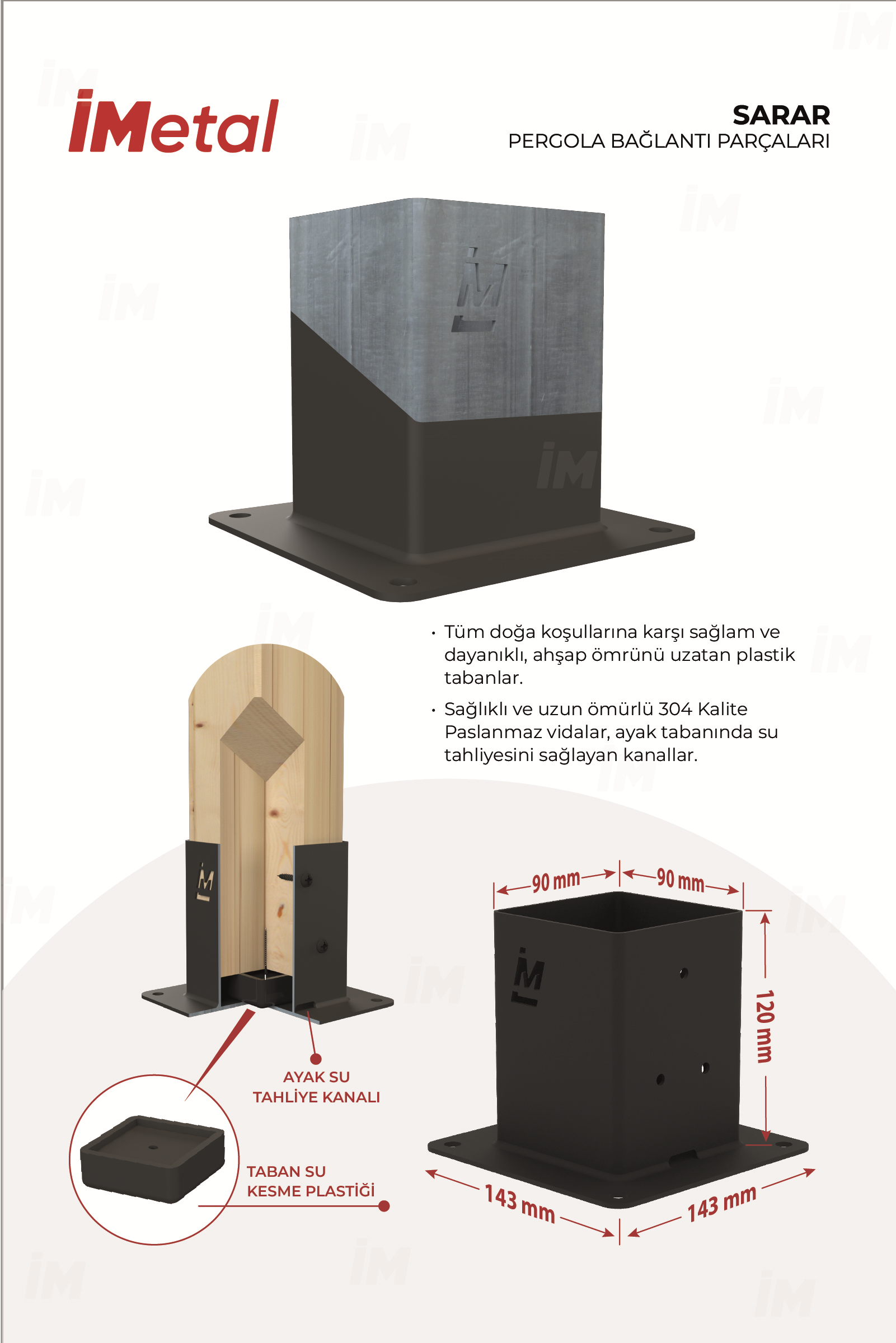 9x9 kare kesitli galvanizli karbon çelik kutu profilinden yapılmış bağlantı parçaları antrasit toz boya ile boyanmış ve pişirilmiştir. Çok güçlü, dayanıklı ve uzun ömürlü yük taşıma performansına sahiptir. Genel yapı kerestenin bütün uçlarını kapayacak şekilde tasarlanmıştır, böylece ahşap çürümeyecek ve uzun yıllar güneş ve yağmurdan etkilenmeyecektir.
