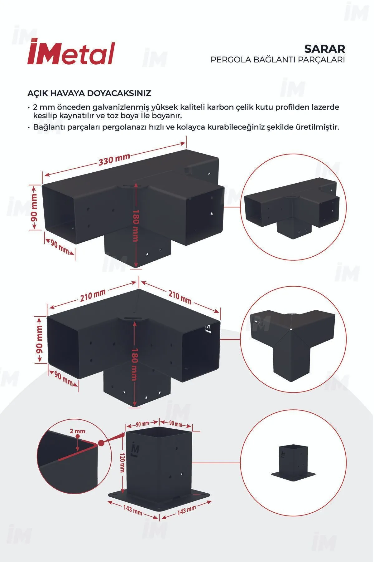 2 mm kalınlığında dış mekan galvaniz kaplamalı yüksek mukavemetli karbon çelik ve kaynaklı sağlam yapı ve korozyona dayanıklı pas önleyici uygulamalı pergola bağlantılarını neşeyle ve güvenle çok uzun süre kullanabilirsiniz.