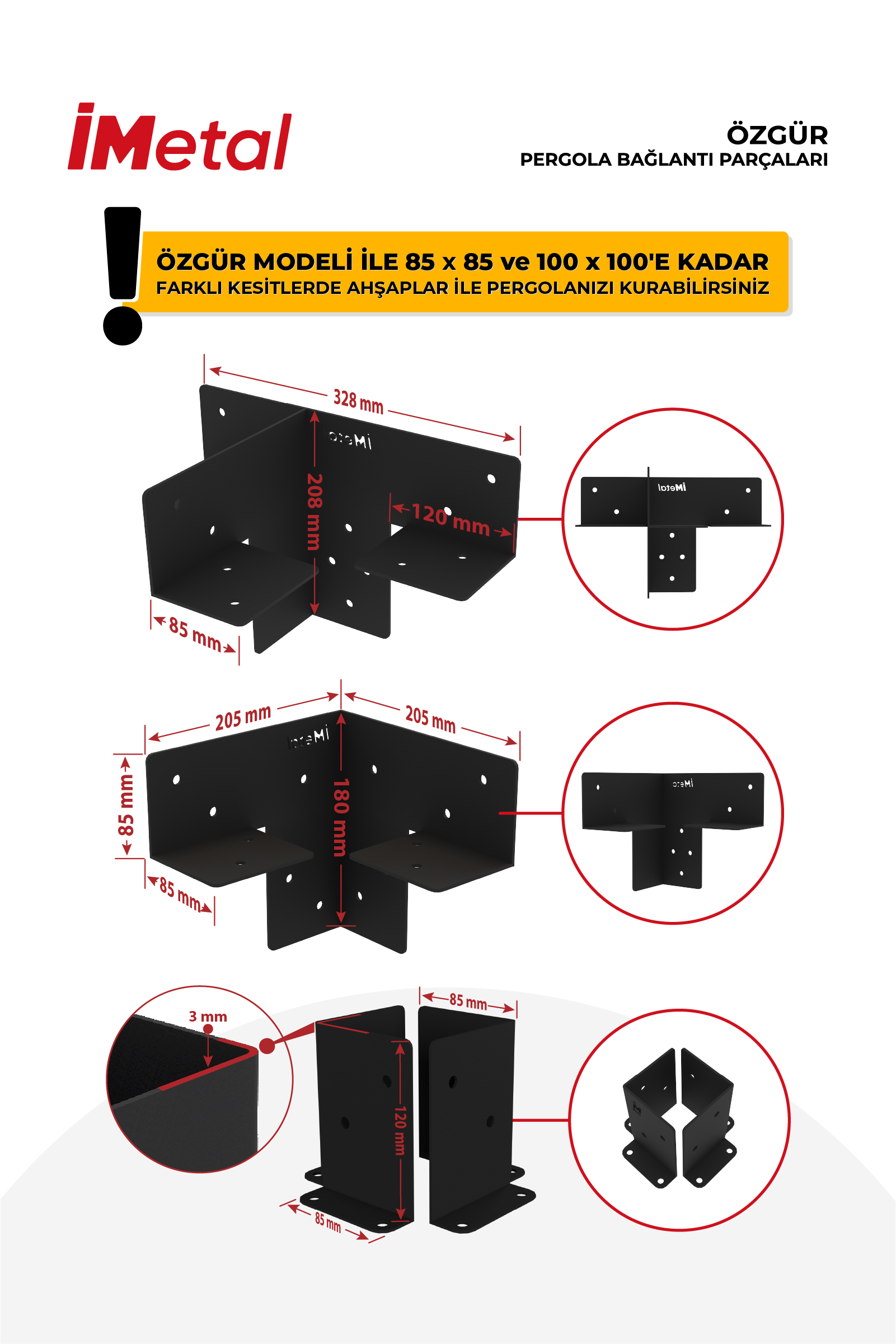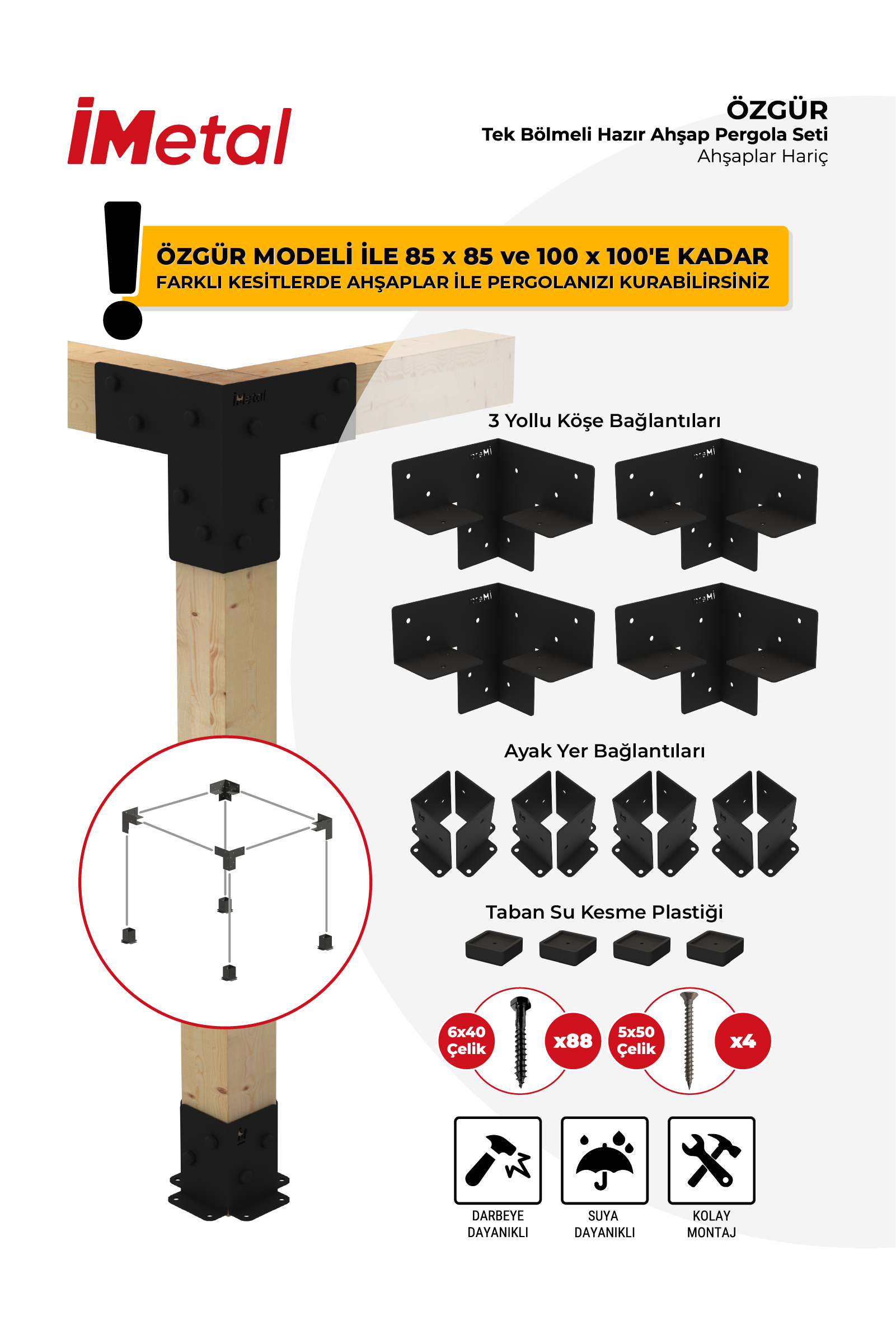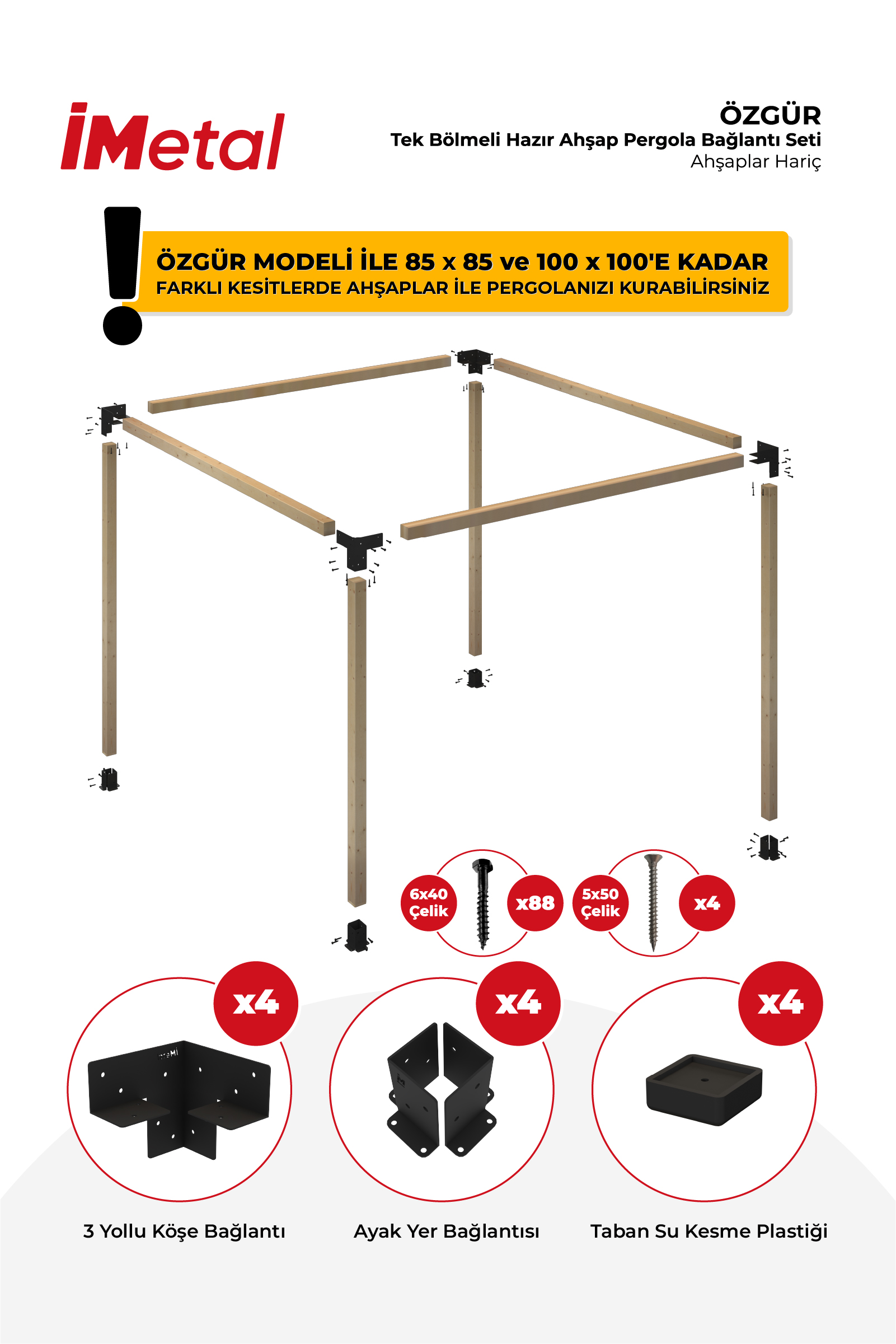 İMetal Ahşap Pergola Braket Seti Tek Bölümlü 90x90'dan 100 x 100 mm'ye kadar Ahşaplar İçin