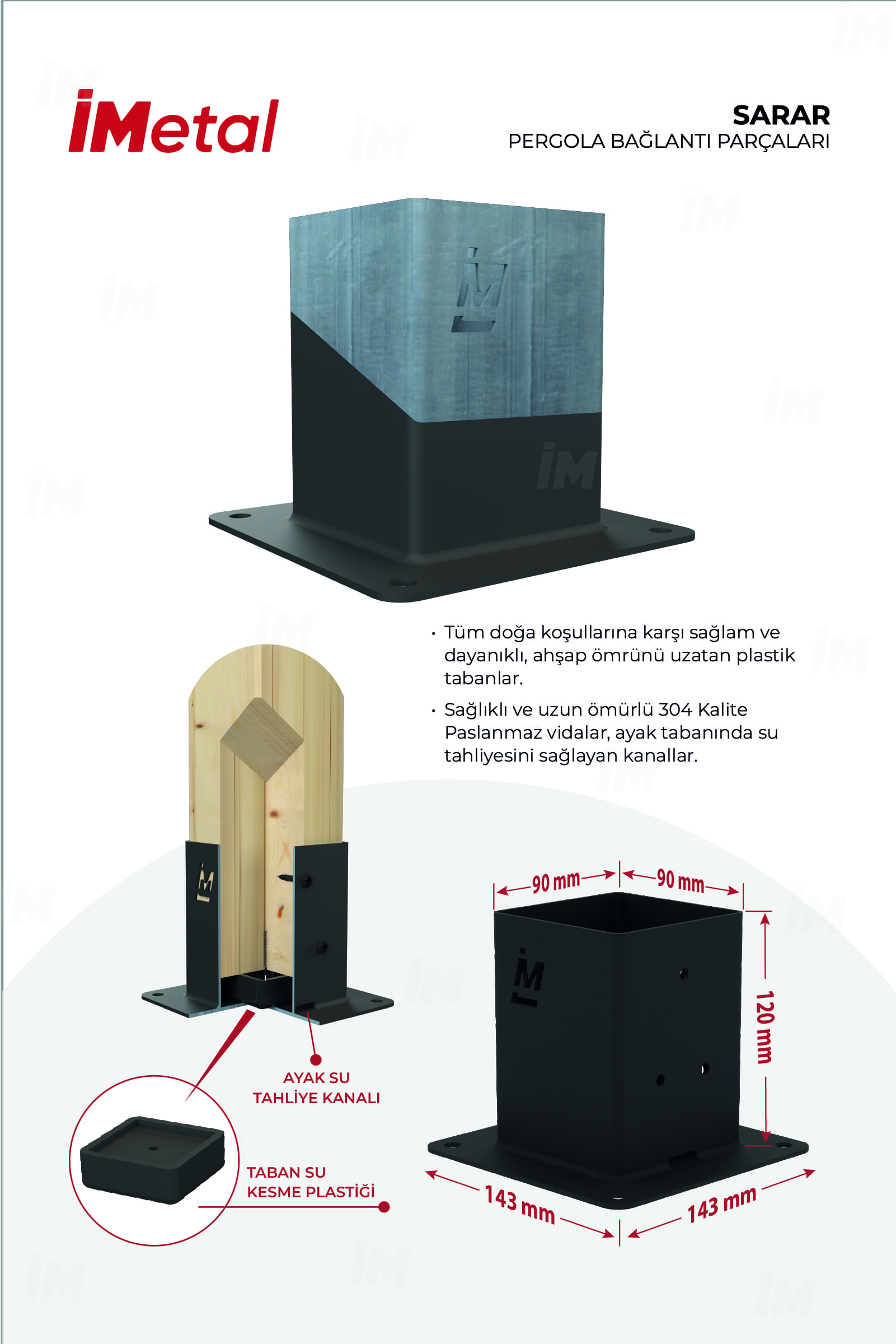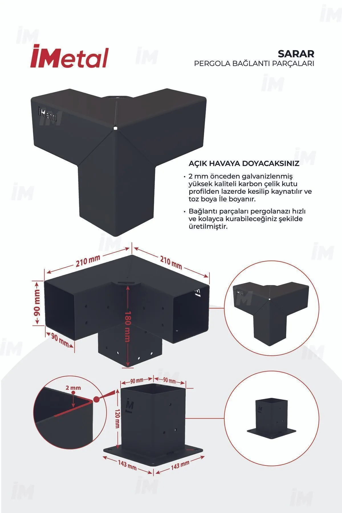İMetal Sarar Bağlantı Setleri İle kanopi, pergola, sundurma, çardak gibi doğaya yakın en güzel alanlarınızı kolayca oluşturabilirsiniz. Bağlantı Köşe ve Ayakları: 2 mm kalınlığında dış mekan galvaniz kaplamalı yüksek mukavemetli karbon çelik ve kaynaklı sağlam yapı ve korozyona dayanıklı pas önleyici uygulamalı pergola bağlantılarını neşeyle ve güvenle çok uzun süre kullanabilirsiniz. 85x85 mm Ahşap Keresteler için: 9x9 kare kesitli galvanizli karbon çelik kutu profilinden yapılmış bağlantı parçaları antrasit toz boya ile boyanmış ve pişirilmiştir. Çok güçlü, dayanıklı ve uzun ömürlü yük taşıma performansına sahiptir. Genel yapı kerestenin bütün uçlarını kapayacak şekilde tasarlanmıştır, böylece ahşap çürümeyecek ve uzun yıllar güneş ve yağmurdan etkilenmeyecektir. Her pergola seti kolay kurulum için metal üzerindeki hazır deliklere sahiptir. Paketteki tüm parçalar pergolanızı kolay ve hızlı şekilde monte etmenize yardımcı olur. Ayak yer bağlantı şekilleri her yerde farklı olabileceğinden tarafınızdan temin edilecektir.