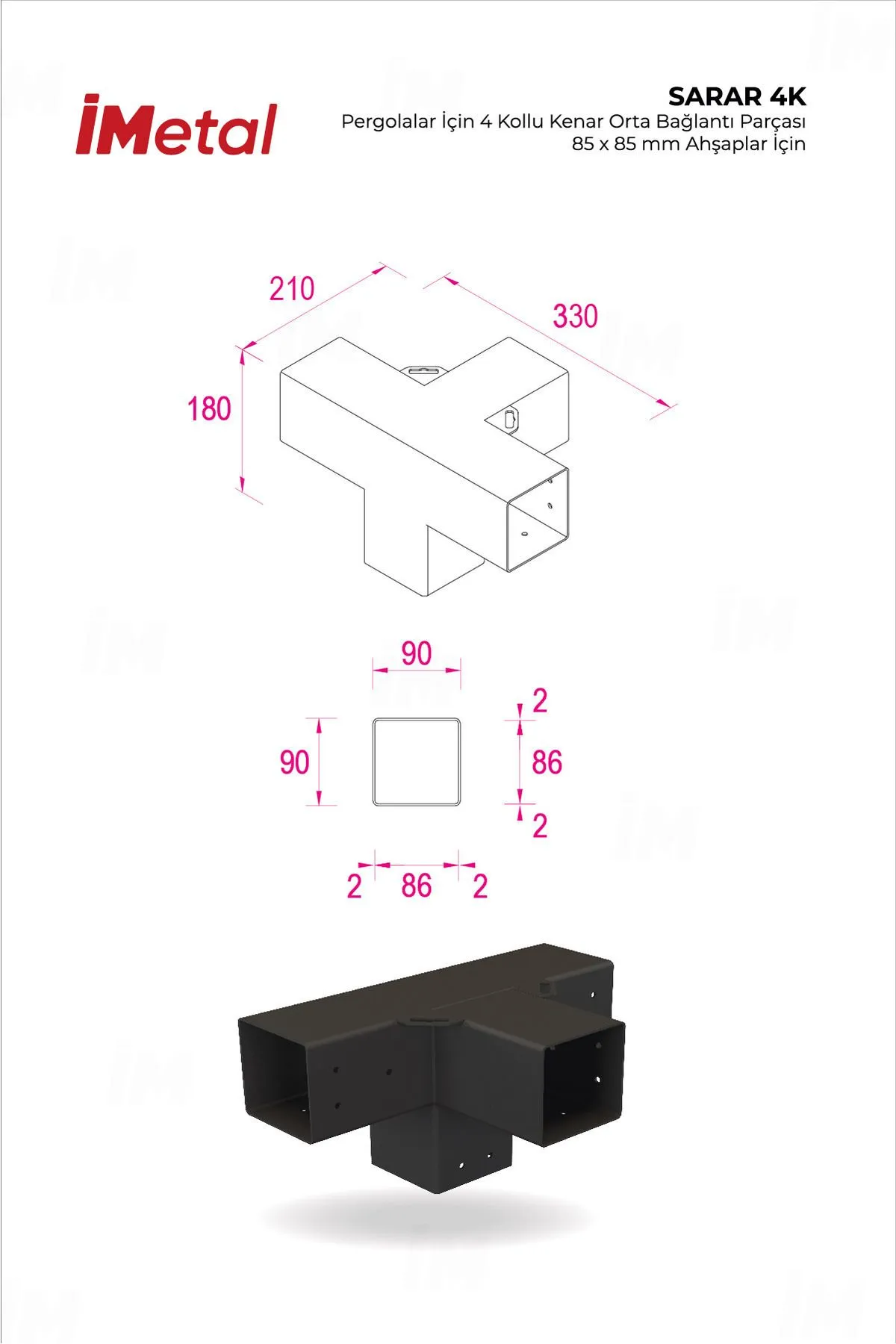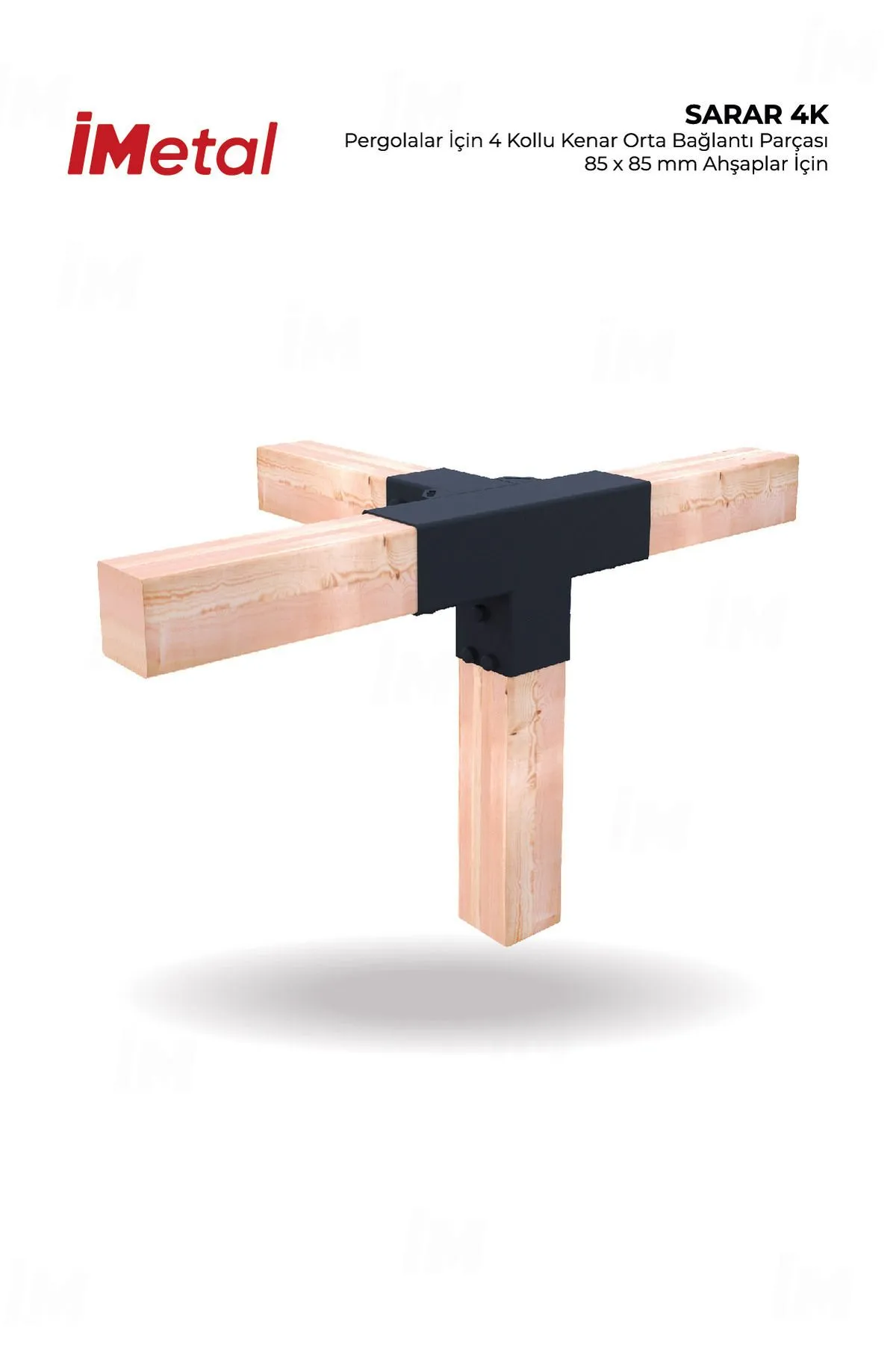 90x90 mm Ahşap Keresteler için 9x9 kare kesitli galvanizli karbon çelik kutu profilinden yapılmış bağlantı parçaları antrasit toz boya ile boyanmış ve pişirilmiştir. Çok güçlü, dayanıklı ve uzun ömürlü yük taşıma performansına sahiptir. Genel yapı kerestenin bütün uçlarını kapayacak şekilde tasarlanmıştır, böylece ahşap çürümeyecek ve uzun yıllar güneş ve yağmurdan etkilenmeyecektir.